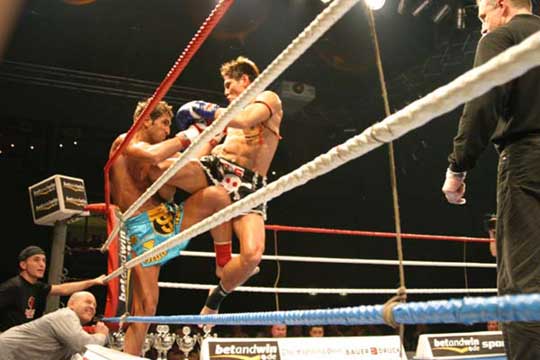 | 2、30分のクリンチワークを再度行います。このときクリンチワークの中でいかにうまく膝を使うかを練習します。 クリンチワークの後、再度腕立て、腹筋など各自足りない部分の筋力トレーニングを行い、ウォームダウンを行います。 |