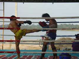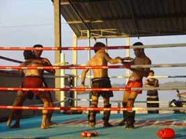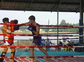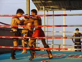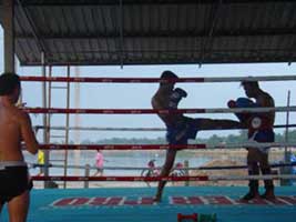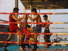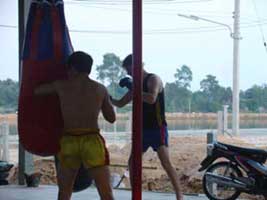 | その後ムエタイで重要なクリンチワークの練習を行います。2、30分のトレーニングの後、腕立て伏せ、腹筋、スクワットなどのトレーニングを行います。 最後に軽いシャドーボクシングやボールを使った運動でウォームダウンを行います。 |